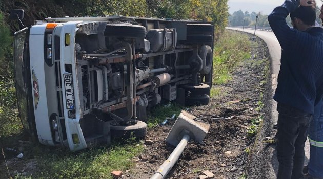 Zonguldak’ta kontrolden çıkarak elektrik direğine çarpan kamyonet yan yattı.