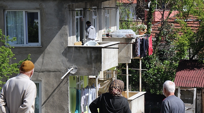 Zonguldak'ta emekli bir maden işçisi, iki katlı binanın üst katındaki evinin balkonunda kendini astı. Mahalleli ise telefonla fotoğraf çekmeye çalıştı.