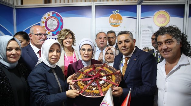 Emine Erdoğan, "Ülkemizin her köşesinden fışkıran zenginliği tescillemek, takdire şayandır. Bir şehre ilk kez gittiğimizde, hemen 'nesi meşhur' diye sorarız. Coğrafi işaret dediğimiz şey, aslında bu sorunun cevabıdır. Gaziantep baklavası, Aydın inciri ve Malatya kayısısı ise, Avrupa Birliğinden coğrafi işaret tescili almış üç ürünümüz. Afyon sucuğu, Kayseri mantısı, Giresun tombul fındığı gibi 15 ürün için de Avrupa Birliği'ne tescil için başvurularımız yapıldı, işlemlerimiz devam ediyor. İnşallah en kısa zamanda bu ürünler de ülkemizin anonim değerleri olarak dünya sahnesine çıkacak. Türkiye'de coğrafi işaret alabilecek ürün sayısı 2 bin 500'e yakın. Yani hemen elimizin altında müthiş bir potansiyel var" dedi.