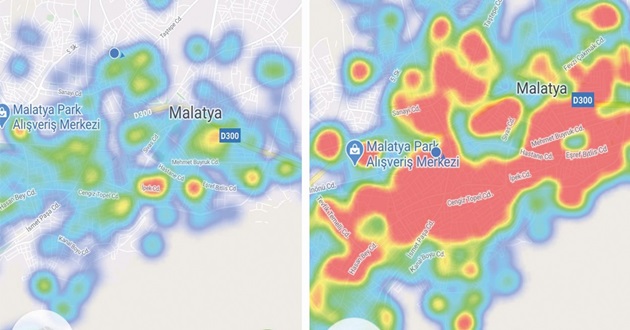 Sağlık Bakanlığı’nın Covid-19 salgınında riskli bölgeleri gösterdiği ‘hayat eve sığar’ mobil uygulamasında Malatya’daki değişim korkutuyor. Korona virüs yayılımını ve riskli bölgeleri gösteren uygulamada özellikle merkez mahallelerde 15 gün öncesi ve sonrası karşılaştırıldığında vaka sayılarının ciddi oranda arttığı görülüyor.