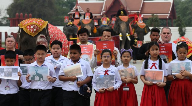 Tayland’ın Ayutthaya şehrinde filler ve öğrenciler, Avustralya’da ölen milyonlarca hayvan için yürüyüş gösterisi düzenledi. Farkındalık oluşturmak isteyen öğrenciler “Avustralya için dua edin” yazılı pankartlar taşıdı.