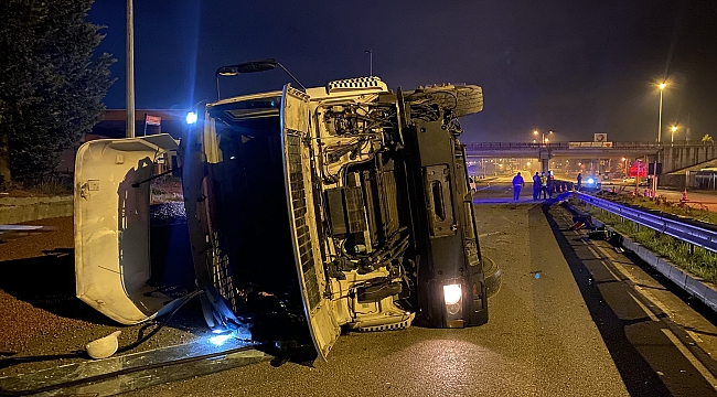 Düzce D-100 karayolu Cumayeri ilçesi sapağında fındık yüklü tır yan yattı, kazada sürücü yaralandı.