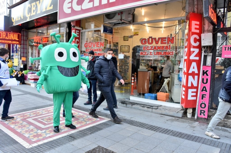 Korona virüs vakalarının bir hayli yüksek olduğu Malatya’da, vatandaşların maske ve sosyal mesafe kurallarına uymaları yönünde farkındalık oluşturmak adına virüs şekline giren iki maskot Malatya sokaklarında gün boyu dolaşarak kurallara uymayanları uyardı.