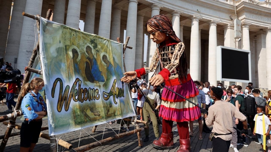Suriyeli mülteci çocukların yaşadığı zorlukların dünya gündemine taşınması amacıyla tasarlanan 3,5 metre uzunluğundaki kukla "Küçük Amal", Vatikan'a ulaştı.