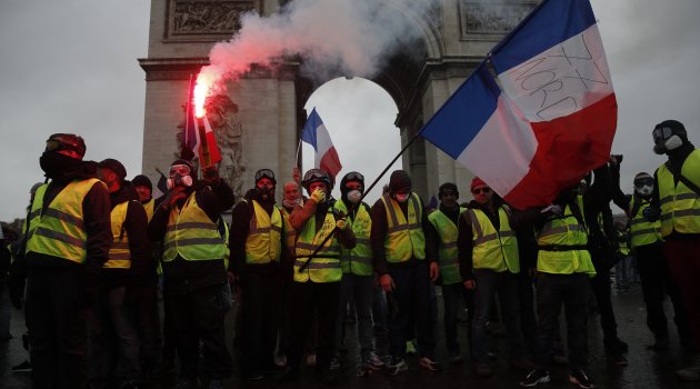 Champs-Elysees Caddesi’nin sonundaki Zafer Takı etrafında toplanan göstericilerin ilk dalgası caddeye girmeye çalışınca polis önceki gösterilere nazaran çok daha fazla göz yaşartıcı gaz kullandı. Protestocular, taş atarak ve sokaklardan topladıkları bisikletleri yakarak polise karşılık verdi.