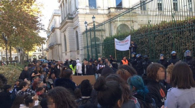 Öğrencilerden bazıları "Navigasyona ihtiyacımız var, geleceğimizi kaybettik" ve "Macron istifa" sloganları atarken, bazı eylemciler çöp kutularını yaktı. Polis öğrencilere biber gazı ile müdahale etti.