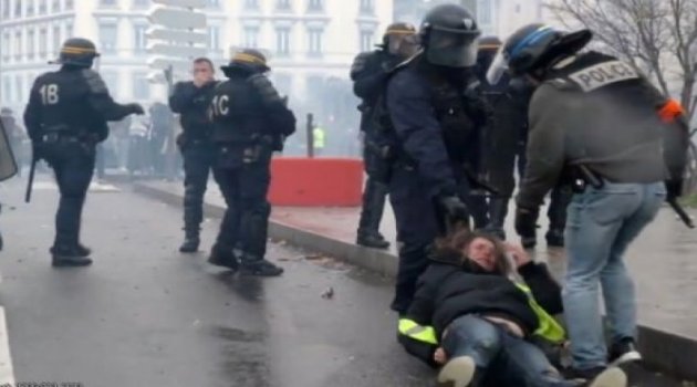 Fransız polisinin Sarı Yelekliler protestosuna katılan bir genci yerlerde sürüklediği anlar kameralara yansıdı.