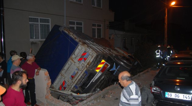 Tekirdağ'ın Malkara ilçesinde park halindeyken freni patlayan kamyon, park halindeki araçlara çarparak bir evin bahçesine daldı.