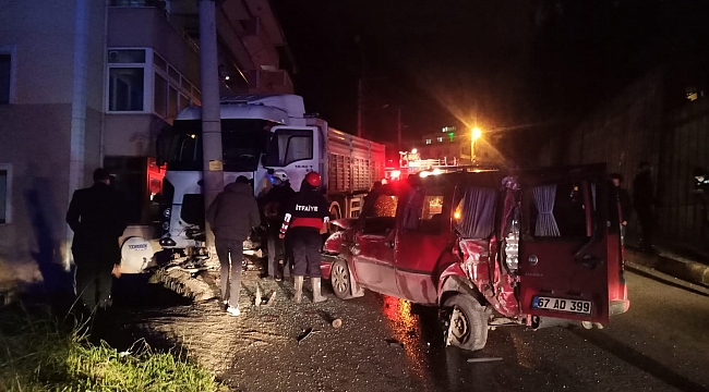 Zonguldak’ta freni patlayan tır elektrik direğine ve park hallindeki araca çarparak durabildi.
