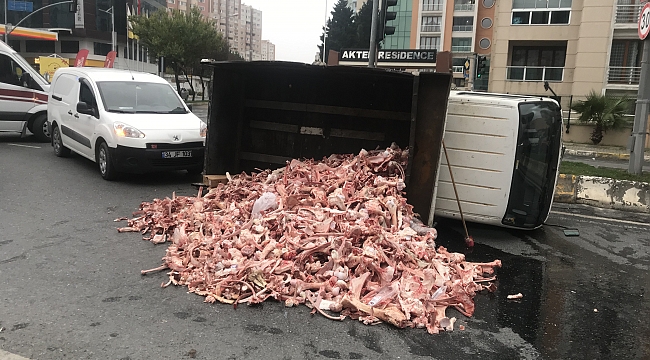 Büyükçekmece'de freni boşalan kemik yüklü kamyonet işlek caddede 300 metre kendi kendine hareket ettikten sonra önce bir araca ardından da refüje çarparak devrildi.