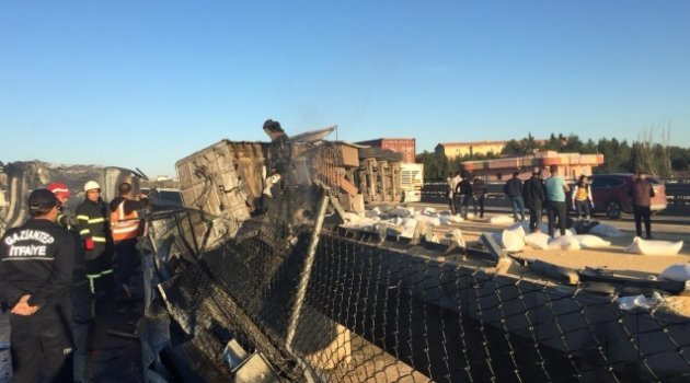 Edinilen bilgiye göre, Gaziantep istikametinden Şanlıurfa istikametine giden Mehmet N. yönetimindeki yem yüklü tırın Nizip ilçe çıkışında tekeri patladı. Kontrolden çıkan tır, köprüdeki korkuluklara takılarak köprüden aşağı sarktı. Tırın bazı parçaları köprüden düşerken, köprüde asılı kalan tırda ise yangın çıktı. Savaş alanını andıran görüntülerin ortaya çıktığı kaza yerine çok sayıda itfaiye ve sağlık ekibi sevk edildi. Alevlerin arasında kalan sürücü itfaiye ekipleri tarafından askıda kalan tırın içerisinden çıkarılarak ilk müdahalesi yapıldı. Vücudunun çeşitli yerlerinde yanıklar meydana gelen sürücü, ilk müdahalenin ardından hastaneye kaldırıldı. Hastanede tedavi altına alınan şoförün hayati tehlikesinin bulunduğu öğrenildi.