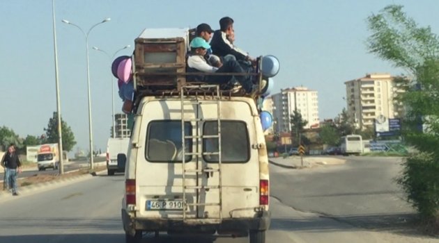 Gaziantep’te içerisinde ve üst kısmında tamamen eşya ile doldurulan bir transit tipi aracın üzerinde yolculuk yapan 4 kişinin tehlikeli yolculuğu görenleri korkuttu. Çevredeki sürücü ve vatandaşları ilk gördüğünde gülümseten görüntülerde, aracın tepesinde eşyalarla birlikte yolculuk eden 4 kişi yürekleri ağza getirdi. Tüm uyarı ve tehlikeye rağmen yolculuklarını sürdüren 4 kişi etrafındaki meraklı ve korkulu gözlere aldırış etmeden hallerinden memnun bir şekilde yollarına devam etti.