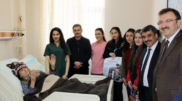 İlçe Sosyal Yardımlaşma ve Dayanışma Vakfı Müdürlüğü tarafından yürütülen proje çerçevesinde, proje koordinatörü Alaattin Ataş ile birlikte hastanedeki hastaları ziyaret eden öğrenciler hastalara acil şifalar temennisinde bulundu.