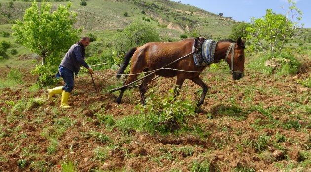 Batman'ın Gercüş ilçesinde arazilerin engebeli oluşundan dolayı traktörlerin girmediği tarla ve bağlar, hayvanlarla sürülüyor.