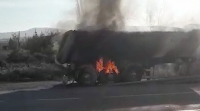 Kırıkkale’de kum yüklü hafriyat tırının yanan lastikleri itfaiye ekiplerince söndürüldü.