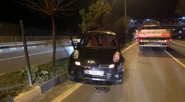 Zonguldak Alaplı ilçesinde hatalı sollama yaptığı ileri sürülen tır otomobile çarptı. Refüje çıkan otomobildeki sürücü kazayı yara almadan atlattı.