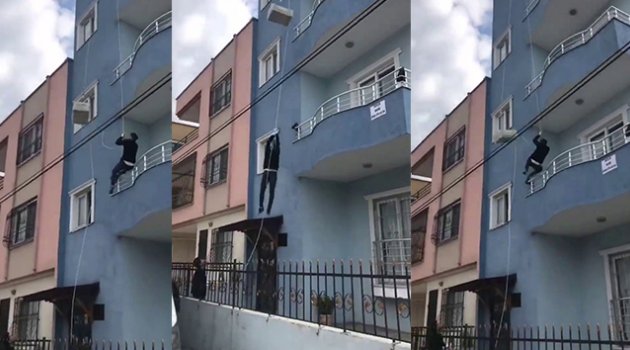 Sosyal medyada on binlerce kişinin izlediği ve Adana'da çekildiği söylenen videoda bir genç, bir apartmanın 4. katına monte edilen makarayla kendisini son kattan boşluğa bırakarak eşya taşıyor. Diğer ucunda kolinin bağlı bulunduğu halata tutunan genç, 4'üncü kattan kendini boşluğa bırakıyor.