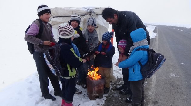 Muş’un Mercimekkale köyüne yaklaşık 3 kilometre mesafede ikamet eden Engin ailesi, çocuklarının eğitimlerini tamamlaması için büyük fedakarlık gösteriyor. Sabahın erken saatlerinde Muş-Varto karayoluna ulaşabilmek için belli bir mesafe karda yürüyen Yakup Engin ve çocukları, burada taşımalı eğitim servisini bekliyor. Çocuklarını soğuk havadan korumak için yol kenarına çadırdan kulübe yapan baba Yakup Engin, üşümemeleri için de tenekede ateş yakarak ısınmalarını sağlıyor.