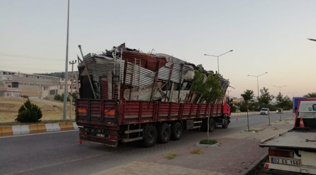Adıyaman'ın Gölbaşı ilçesi Kahramanmaraş karayolu üzerinde kapasitesinden fazla hurda yüklenen kamyon trafikte tehlikeye neden oldu.