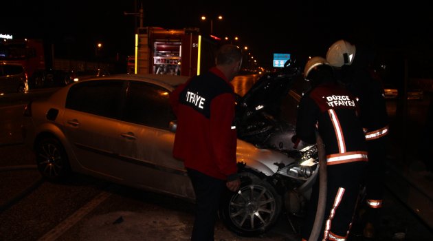 Alınan bilgilere göre, Bolu’dan Sakarya istikametine giden Yalçın D. idaresindeki 36 AB 238 plakalı otomobil, Olimpiyat Kavşağı’ndan yan yola dönmeye çalışan Talha A. idaresindeki 81 EP 532 plakalı otomobille çarpıştı. Çarpmanın etkisi ile Yalçın D. idaresindeki otomobil motor kısmından bir anda yanmaya başladı. Çevrede bulunanların haber vermesi ile olay yerine gelen Düzce Belediyesi İtfaiye Müdürlüğü ekipleri yangını kontrol altına alarak söndürdü. Yangında araç kullanılmaz hale gelirken kazada yaralanan olmadı. Kaza nedeniyle kapanan yol araçların çekici yardımı ile çekilmesi ile tekrar trafiğe açıldı.