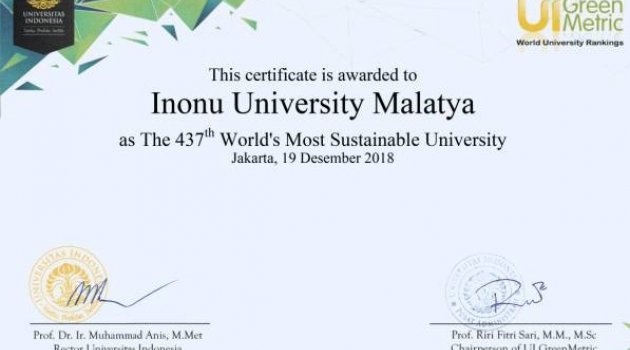 Dünyada olduğu gibi Türkiye’deki üniversiteleri de yapı/yerleşke, enerji yönetimi, ulaşım, atık yönetimi ve sürdürülebilir çevre eğitimi kategorilerinde değerlendiren UI Green Metric’in 2018 raporunda İnönü Üniversitesi Türkiye özelinde 17’inci sırada yer aldı. Türkiye’deki üniversitelerin değerlendirildiği raporda İnönü Üniversitesinin enerji yönetiminde 2’inci, yerleşkede 5’inci, ulaşım kategorisinde ise 6’ıncı sırada yer alması dikkat çekti. Aynı rapora göre atık yönetiminde 25’inci sırada bulunan İnönü Üniversitesi, eğitimde 27’nci sırada yer alırken su yönetiminde ise 28’inci sırada yer aldı.