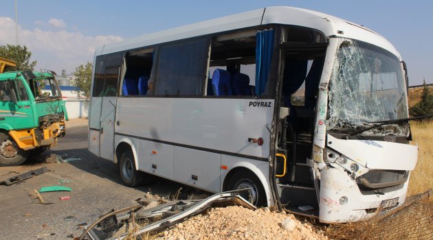 Gaziantep'te bir fabrikaya işçi taşıyan servis otobüsü ile hafriyat kamyonun kafa kafaya çarpışması sonucu 15 kişi yaralandı.