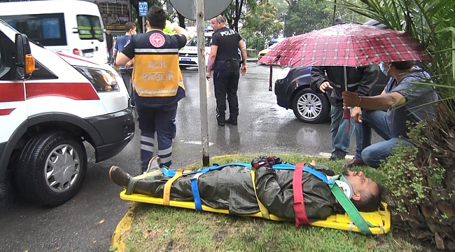Zonguldak'ın Ereğli ilçesinde motosiklet ile otomobilin çarpışması sonucu motosiklet sürücüsü yaralandı. Bir vatandaş, yaralı ambulansa binene kadar ıslanmasın diye şemsiye ile başında bekledi.