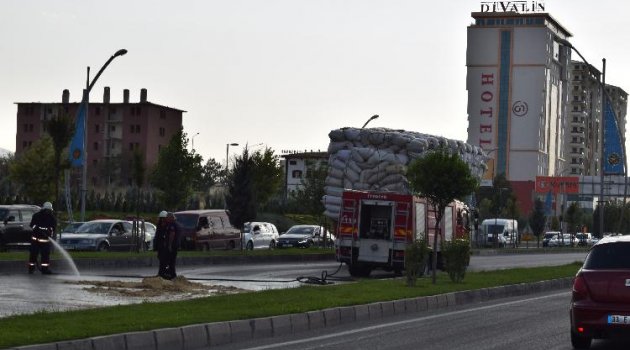 Trafik ekiplerinin yolda önlem aldığı olay sonrası saman yüklü kamyon yoluna devam etti.