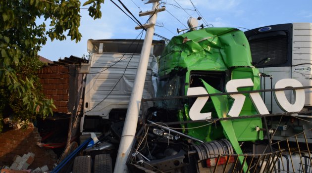 İzmir’in Menemen ilçesinde çarpışan iki tır korku dolu anlar yaşanmasına neden oldu. Çarpışmanın şiddetiyle tırlar yol kenarında bulunan bir iş yerine çarparak durabildi. İki tırın çarpışma anı saniye saniye güvenlik kamerasına yansıdı.