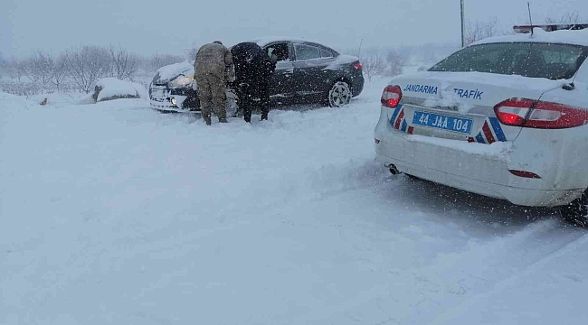 Malatya İl Jandarma Komutanlığı Asayiş ve Trafik timlerince, karda yolda kalanlara yardım yapılıyor.