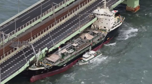 Şiddetli rüzgarlar nedeniyle kontrolden çıkan bir yakıt tankeri, havalimanını Osaka'daki Izumisano şehrine bağlayan köprüye çarptı. On bir mürettebat bulunan gemide şans eseri yaralanan olmadı.