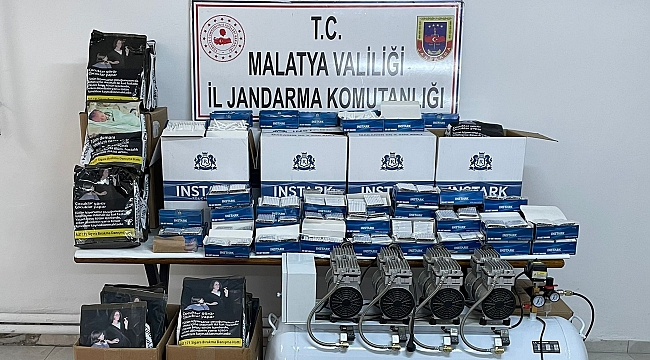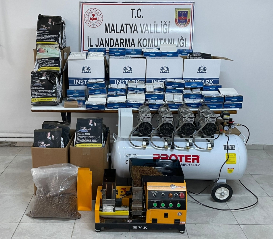 Malatya İl Jandarma Komutanlığı Kaçakçılık ve Organize Suçlarla Şubesi ile Battalgazi İlçe Jandarma görevlileri tarafından yapılan arama sonucunda iş yerinde, 1 adet kompresör, bir adet makaron dolum makinas, 5 bin 700 paket kaçak sigara, 66 bin adet bandrolsüz makaron ve 33 kilogram kıyılmış tütün ele geçirildi.