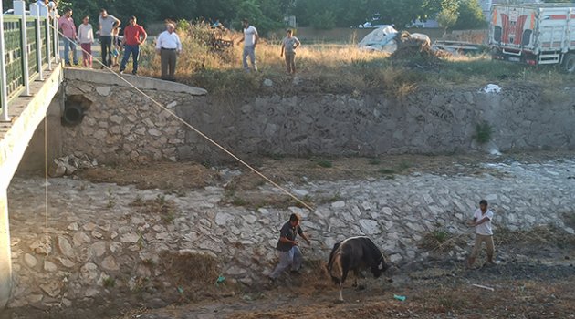 Öte yandan, vatandaşların kurbanlığın yakalanması için verilen mücadeleyi film izler gibi seyretmeleri ise ilginç görüntüler oluşturdu.