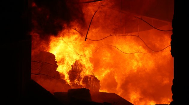 Fabrikanın tamamını saran alevler dört koldan kontrol altına alınmaya çalışılıyor. İş makineleriyle fabrikanın duvarları yıkılarak, depo bölümünde yangının merkezine ulaşılmaya çalışılıyor.