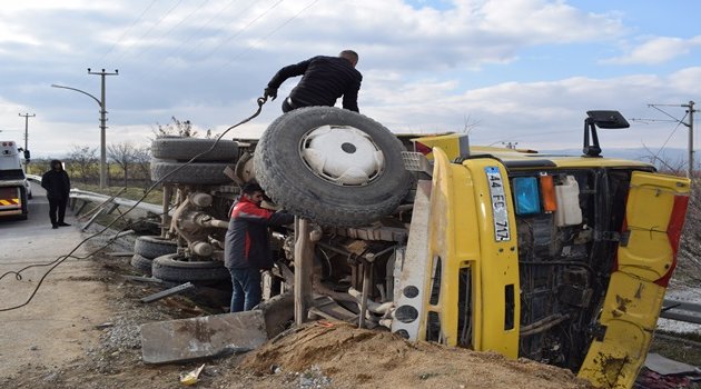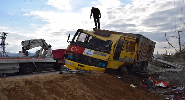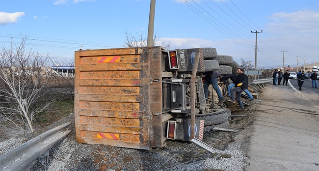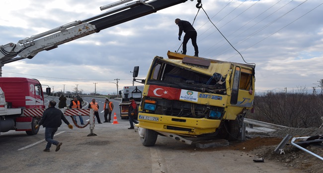 HASAN ERYILMAZ/ Malatya’da taş ocağından çıkan bir kamyonun freni patlayınca yolun karşı şeridine geçerek bariyerlere çarptı.