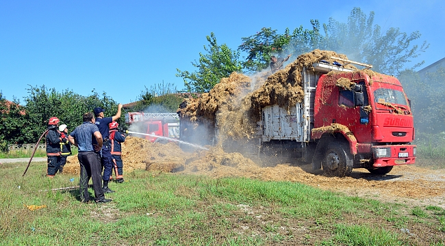 Kamyon kasasındaki samanlar alev aldı