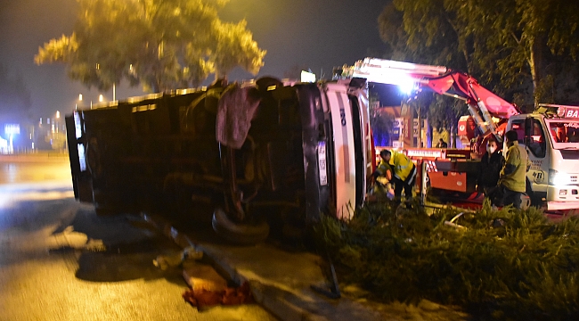 İzmir'in Gaziemir ilçesinde sürücüsünün direksiyon hakimiyetini kaybettiği bir kamyon yan yatarak devrildi. Kazada kamyon sürücüsü ağır yaralandı.