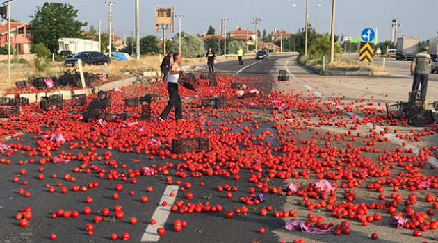 Konya’nın Ereğli ilçesinde kontrolden çıkan domates yüklü tır karşı şeride geçerken savrulan kasalarla karayolu adeta domates tarlasına döndü.
