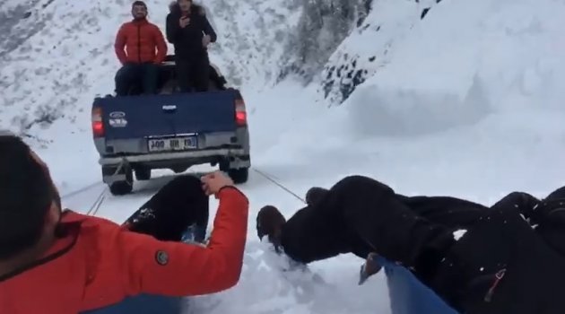 Artvin’de geçtiğimiz günlerde etkili olan kar yağışı ile birlikte yüksek kesimler beyaza büründü. Bin 940 rakımlı Borçka-Macahel karayolundaki karı fırsat bilen Sedat Gülbin, Şener Gökdemir ve Emre Ertürk arazi araçlarıyla çıktıkları karayolunda kamyonetin arkasına iple bağladıkları leğenle kaydılar. Kayak keyfine farklı bir bakış açısı getiren vatandaşlar, o anları cep telefonu ile kaydetti.