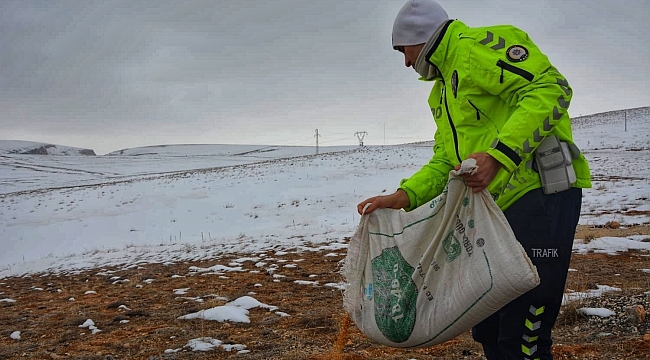 Karda yiyecek bulmakta zorlanan hayvanlara polis şefkati