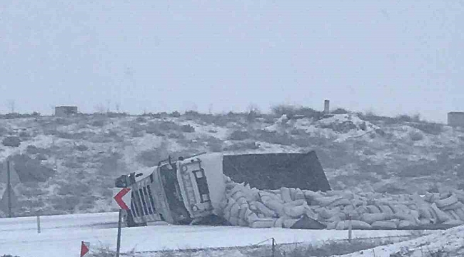 Malatya-Sivas karayolunda kar nedeniyle kayganlaşan yolda devrilen tır yolu trafiğe kapatırken, kazada yaralanan olmadı.