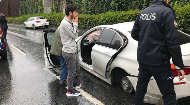 Esenler Aksaray istikametinde kayganlaşan yolda direksiyon hakimiyetini kaybeden sürücü, yol kenarındaki çalılara ve duvara çarptı. Çarpmanın etkisiyle sürüklenen aracın lastikleri fırladı.