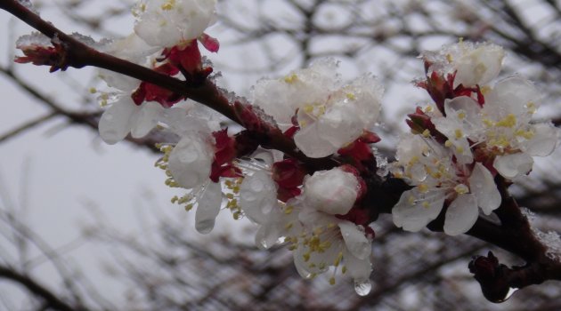Kayısı çiçeğine kar düştü