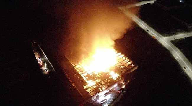 Çok sayıda itfaiye ekibinin müdahale ettiği yangın sürerken, yükselen alevler havadan görüntülendi.