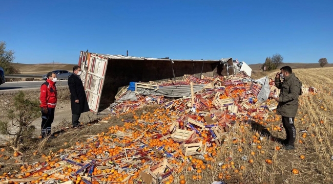 Edinilen bilgiye göre; Antalya’dan Samsun’a mandalina taşıyan Mustafa K. idaresindeki tır Tokat-Sivas karayolu kızıliniş mevkiinde şarampole devrildi. Sürücüsünün direksiyon hakimiyetini kaybetmesi sonucu yan yatan tırda bulunan mandalinalar araziye saçıldı.