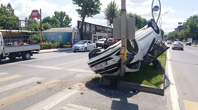 Sakarya’nın Adapazarı ilçesinde önündeki servis aracına çarpmamak için sürücüsünün manevra yaptığı otomobil, refüje çarparak ters döndü. Meydana gelen kazada sürücü yaralandı.