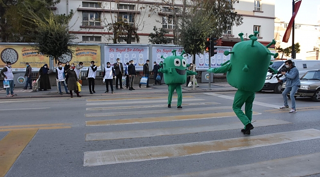 Korona virüs vakalarının bir hayli yüksek olduğu Malatya’da, vatandaşların maske ve sosyal mesafe kurallarına uymaları yönünde farkındalık oluşturmak adına virüs şekline giren iki maskot Malatya sokaklarında gün boyu dolaşarak kurallara uymayanları uyardı.