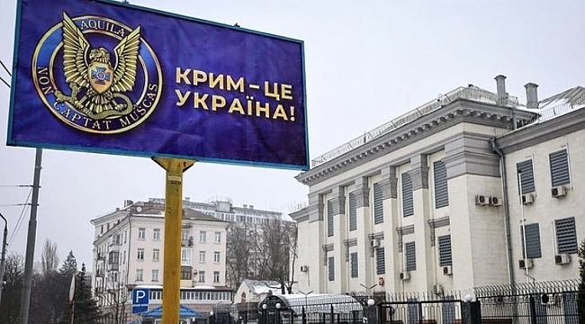 Ukrayna’nın başkenti Kiev’de bulunan Rusya Büyükelçiliği’nin çevresinde yer alan reklam panolarına "Kırım Ukrayna’dır" yazılı afişler asıldı.