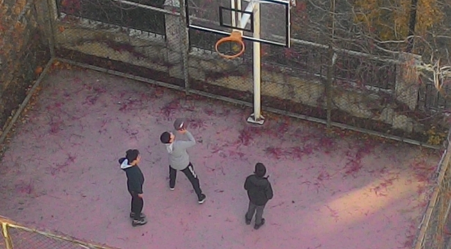 Apartman sitesi içerisinde basketbol sahasında basket oynayan çocukların bir kısmını da site içiresindeki çimenlerin üzerinde futbol topu ile zamanını geçirdi.