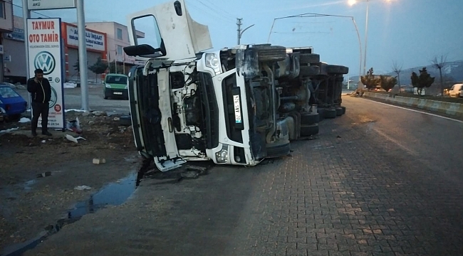 Adıyaman’ın Gölbaşı ilçesinde Sanayi Sitesi Kavşağı’nda sürücüsünün kontrolünden çıkan Tır yan yattı.